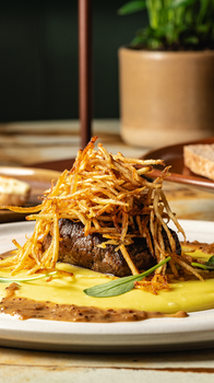 beterrabas assadas combinadas com purê de batata e um toque de tomilho. Finalizado com bolinhas de queijo de cabra, ceboulette fresca e fio de azeite (300g)